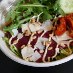 Salade met mozzarella, sla, tomatensalsa en olijf. Deze salade wordt geserveerd met een stukje stokbrood.